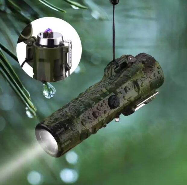 Um isqueiro moderno com acendedor de plasma e lanterna integrada, ideal para uso em qualquer situação, inclusive úmida.