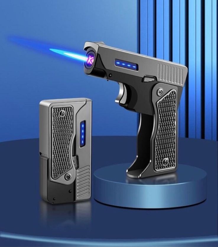 Um isqueiro moderno que une design de pistola com tecnologia recarregável USB, ideal para uso versátil e prático.